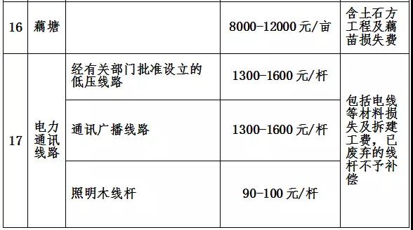 4、国家和省确定的铁路、公路、机场、航道港口、水利工程、能源工程等重大基础设施项目征收土地地上附着物和青苗补偿等标准另有规定的,按照国家或省规定执行。其他电力、电信等设备设施的迁移费按照行业标准执行。